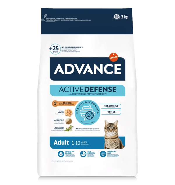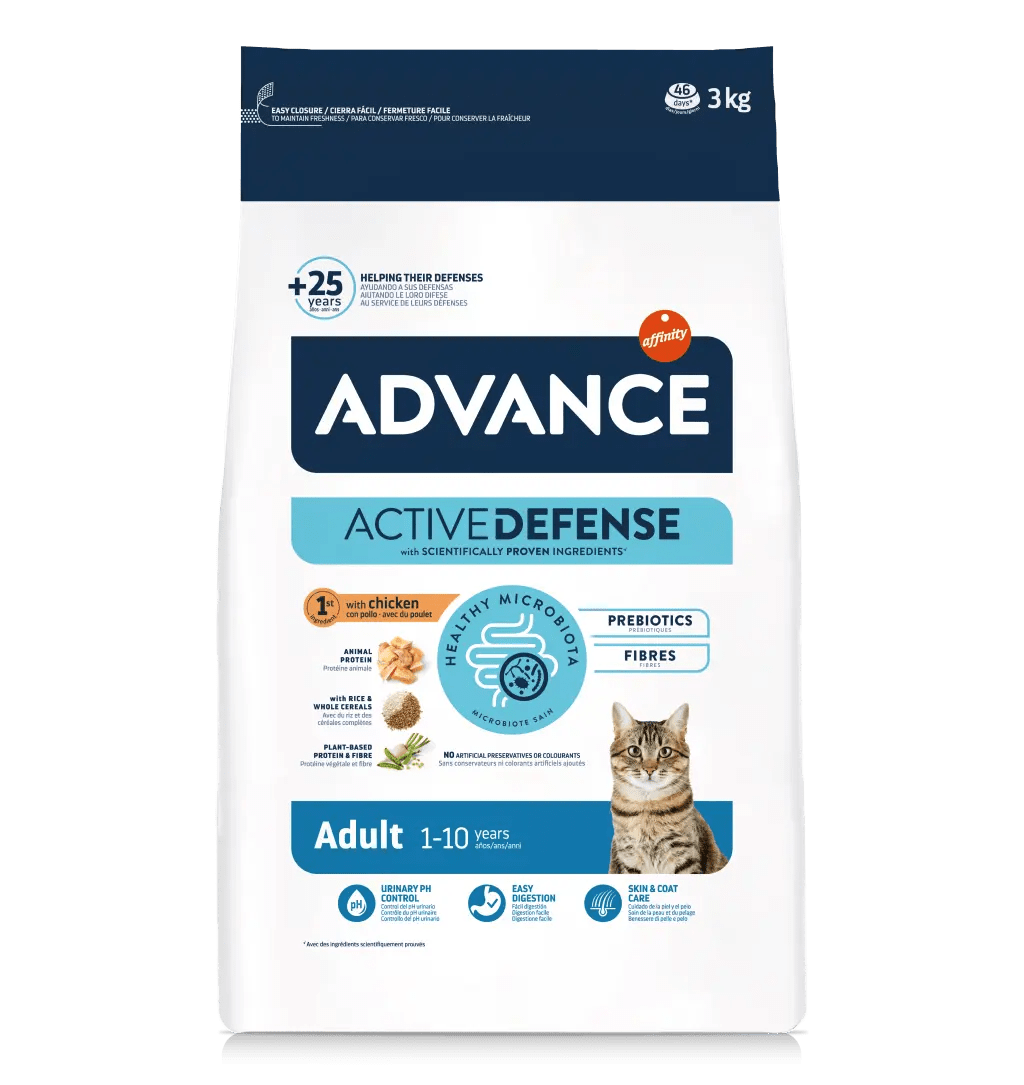 O Advance Adult é uma saborosa receita de alta qualidade que responde às necessidades dos gatos adultos. Foi elaborada com frango como primeiro ingrediente, é fácil de digerir e ajuda a controlar o pH urinário graças aos níveis equilibrados de substâncias minerais. Também contribui para o cuidado da pele e do pelo graças aos ácidos gordos ómega 3 e ómega 6 e ao zinco. O tamanho do croquete adapta-se à mandíbula dos gatos adultos.