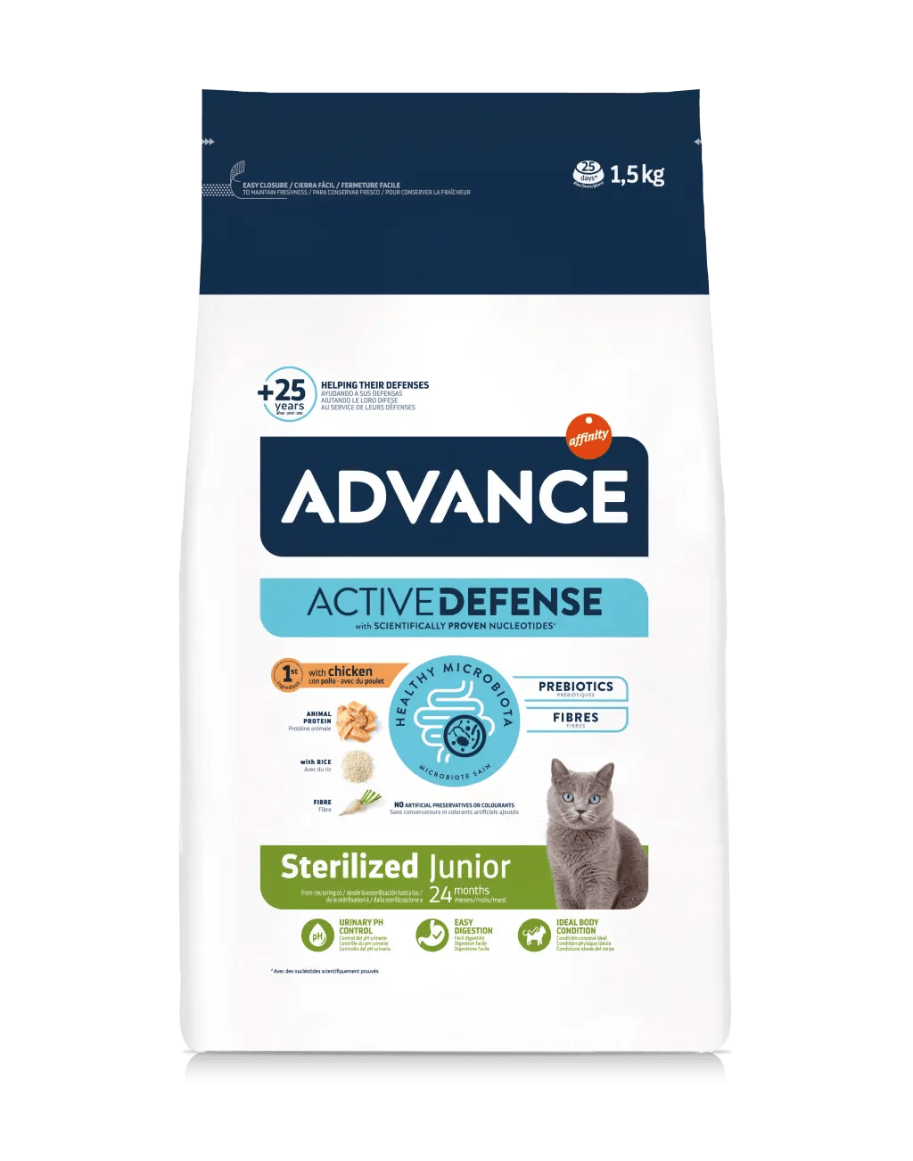 O Advance Sterilized Junior foi especialmente formulado para responder às necessidades nutricionais dos gatos jovens esterilizados. É um alimento fácil de digerir, que ajuda a manter o peso ideal graças ao teor de proteínas e calorias. Também ajuda no controlo do pH urinário porque contém níveis equilibrados de substâncias minerais. O tamanho reduzido do croquete adapta-se à mandíbula dos gatos jovens.