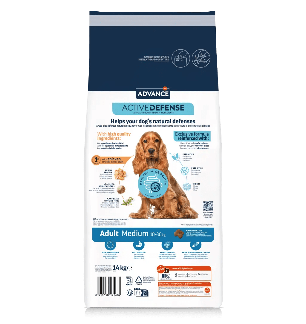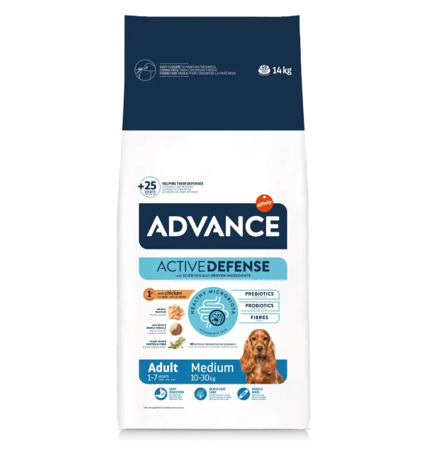Advance Adult Medium é um alimento de alta qualidade, fácil de digerir e formulado para atender às necessidades dos cães adultos de porte médio. É elaborado com frango como primeiro ingrediente. Ajuda a manter a massa muscular graças ao teor de proteína de alta qualidade e contribui para uma pele saudável e um pelo brilhante graças aos ácidos gordos ómega 3 e 6