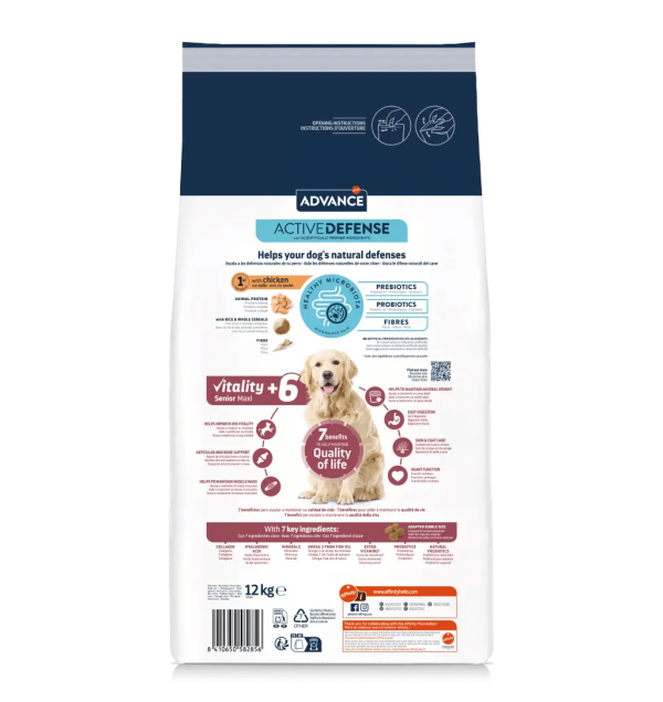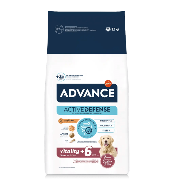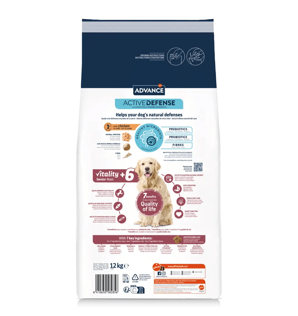 Advance Vitality Senior Maxi +6 ajuda a manter a vitalidade dos cães de porte grande com mais de 6 anos. Proporciona 7 benefícios-chave para a idade, que ajudam a manter a sua qualidade de vida.
