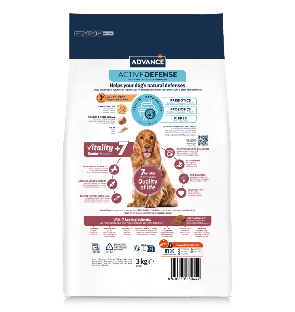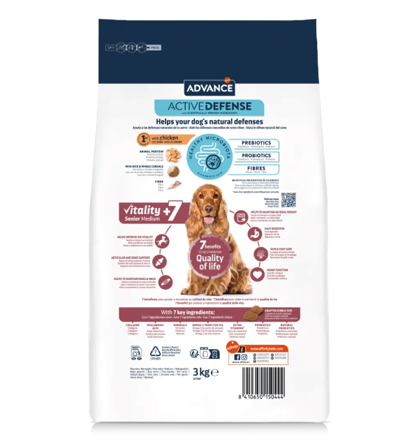 Advance Vitality Senior Medium +7 ajuda a manter a vitalidade dos cães de porte médio com mais de 7 anos. Proporcona 7 benefícios-chave para a idade, que ajudam a manter a sua qualidade de vida.