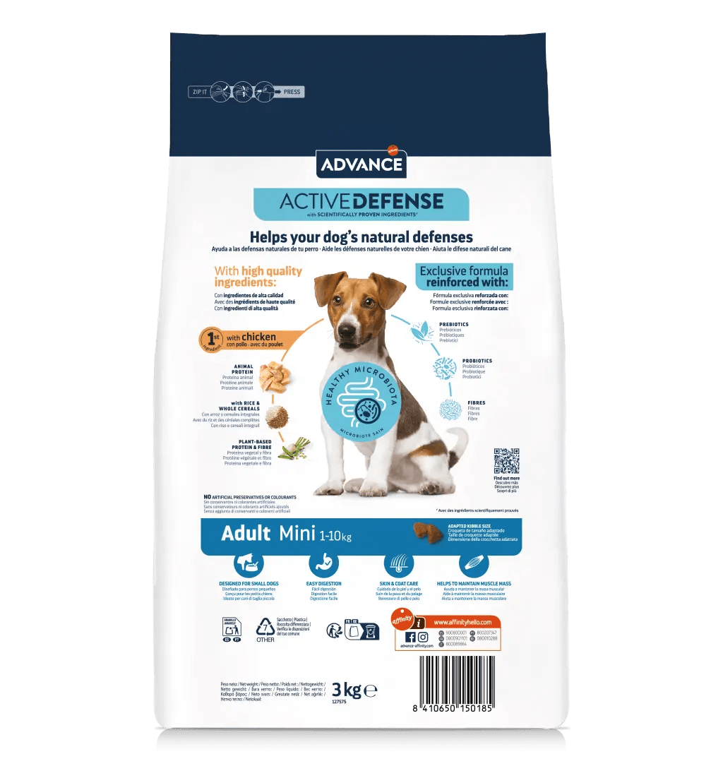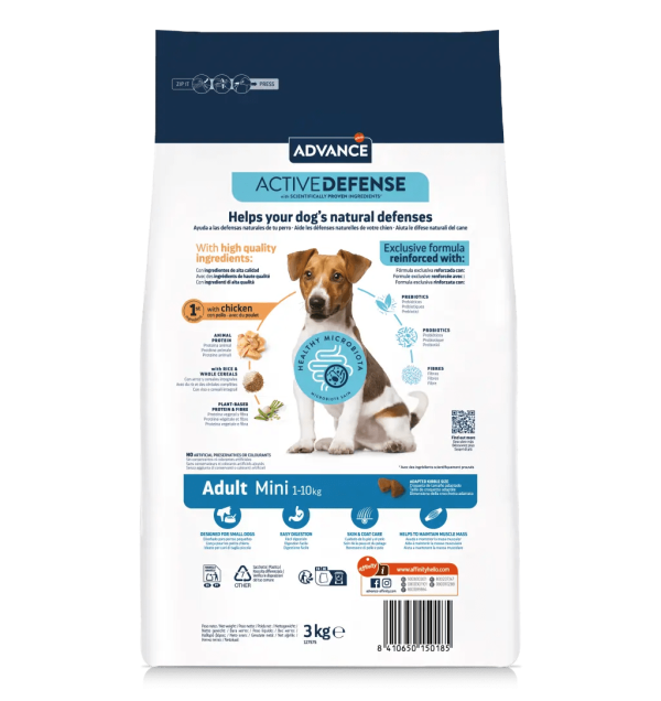 Advance Adult Mini é um alimento de alta qualidade, fácil de digerir e formulado para responder às necessidades dos cães adultos de pequeno porte. É elaborado com frango como primeiro ingrediente. Ajuda a manter a massa muscular graças ao teor de proteína de alta qualidade e contribui para uma pele saudável e um pelo brilhante graças aos ácidos gordos ómega 3 e 6.