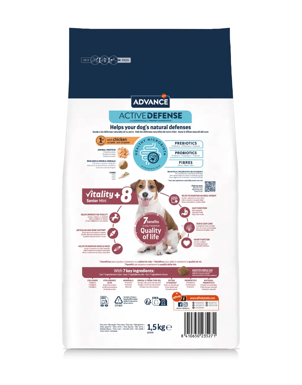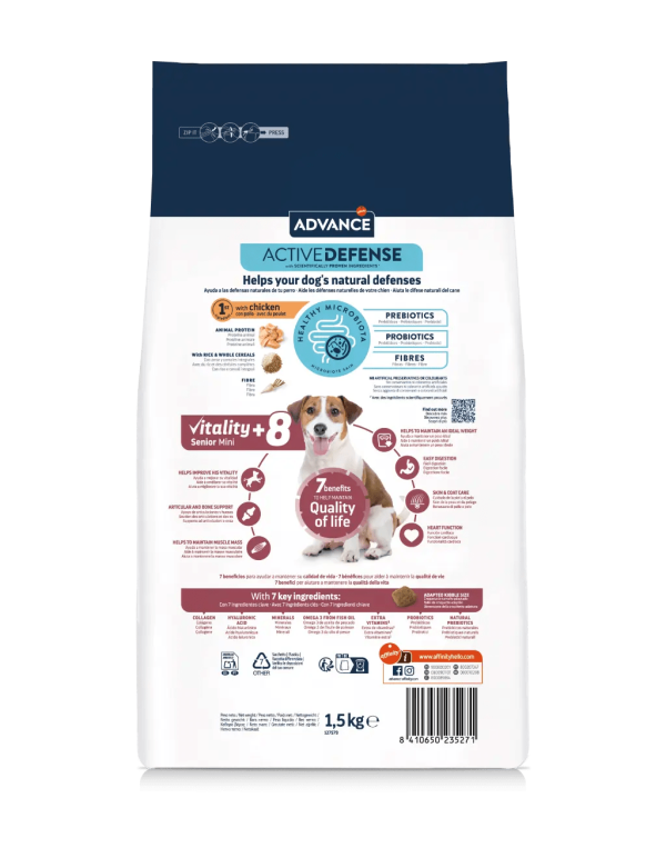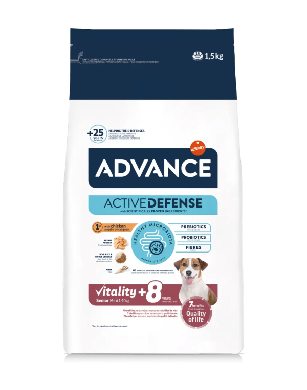 Advance Vitality Senior Mini +8 ajuda a manter a vitalidade dos cães de porte pequeno com mais de 8 anos. Proporciona 7 benefícios-chave para a idade, que ajudam a manter a sua qualidade de vida. É um alimento fácil de digerir e o croquete está adaptado ao tamanho dos cães de porte pequeno.