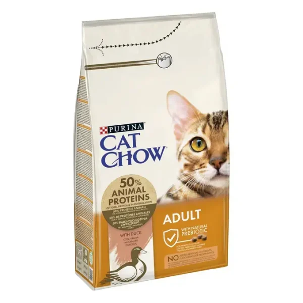 PURINA CAT CHOW Adult é um alimento completo para gatos adultos cuidadosamente formulado com proteína de elevada qualidade e ingredientes naturais, como ervilhas, cenouras, cereais integrais, chicória e leveduras.