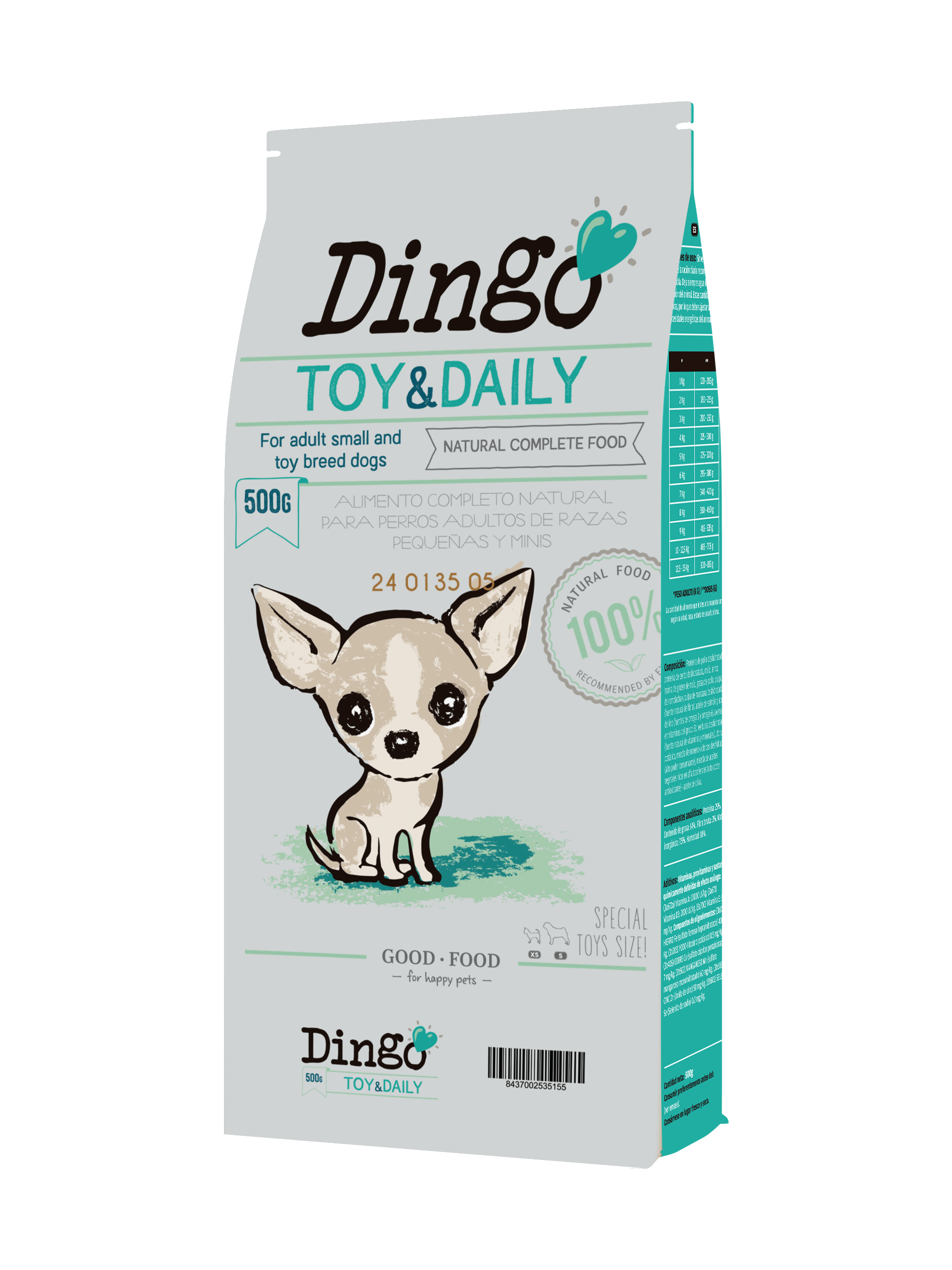 Dingo Toy & Daily é um alimento completo, natural e equilibrado para cães adultos de raças pequenas e mini, com uma atividade diária normal. Fornece uma dieta saudável e equilibrada, ajuda a manter as articulações do cão saudáveis e reforça o seu sistema imunitário. O tamanho dos croquetes é pensado especialmente para que estas raças possam ingerir o alimento da forma ideal.