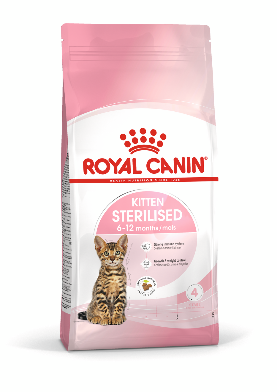 O ROYAL CANIN® Kitten Sterilised é especialmente formulado para apoiar as necessidades nutricionais dos gatinhos esterilizados na “fase de consolidação” do seu crescimento. Esta fórmula é adequada para gatinhos esterilizados de 6 a 12 meses de idade, dado que vivem um período de alterações físicas e comportamentais significativas. Este alimento feito à medida contém um teor moderado de gordura para ajudar a reduzir o risco de aumento de peso, ao mesmo tempo que contém teores ideais de proteínas, cálcio e fósforo para um desenvolvimento saudável. Contém também nutrientes como as vitaminas C e E para apoiar o desenvolvimento do sistema imunitário saudável do gatinho. Estes antioxidantes dietéticos demonstraram estimular um aumento mais elevado e mais rápido dos anticorpos após a vacinação. O ROYAL CANIN® Kitten Sterilised é também enriquecido com ácidos gordos Ómega-3 (DHA) para apoiar o desenvolvimento do cerebral e promover uma visão saudável. Graças a uma combinação de prebióticos benéficos (MOS) e proteínas de elevada digestibilidade, o ROYAL CANIN® Kitten Sterilised também ajuda a apoiar um equilíbrio saudável da microbioma intestinal (flora intestinal) e a saúde digestiva. O croquete da ROYAL CANIN® Kitten Sterilised foi também especialmente concebido para a boca pequenina do seu gatinho. Um efeito de escovagem mecânica enquanto o seu gatinho mastiga ajuda a promover a saúde bucodentária. Quando o seu gatinho esterilizado atingir os 12 meses de idade, precisará de um alimento especialmente adaptado para satisfazer as suas necessidades nutricionais como gato adulto. Nesta fase, pode fazer a transição para a gama ROYAL CANIN® Feline Health Nutrition Sterilised, disponível em alimento seco ou em alimento húmido com três texturas diferentes: pedaços em geleia, pedaços em molho ou patê.